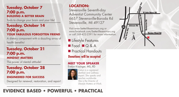 The Stevensville Seventh-day Adventist Church is offering a four part seminar in October entitled "Building a Better Brain." The meetings will take place in the church Community Center, Tuesdays at 7 p.m., October 7, 14, 21, and 28. The speaker is Evelyn Kissinger, a registered dietitian and wellness expert, and director of Lifestyle Matters at Work.
