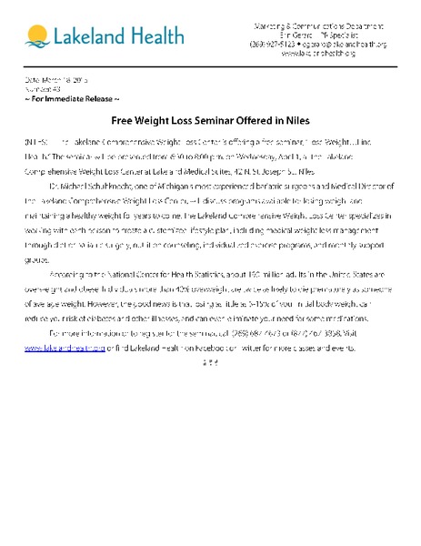 (NILES) –  The Lakeland Comprehensive Weight Loss Centeris offering a free seminar, “Lose Weight…Find Health.” The seminar will be presented from 6:30 to 8:00 p.m. on Wednesday, April 1, at the Lakeland Comprehensive Weight Loss Center at Lakeland Medical Suites, 42 N. St. Joseph St., Niles.