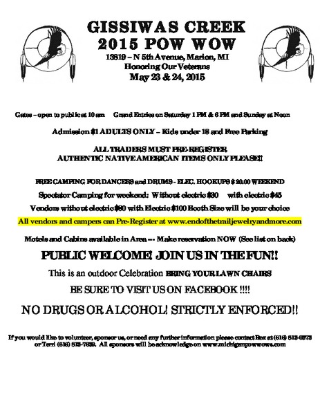 Please come and join in the Native American Celebration on May 24, 2015, at 13819 N 5th Avenue, Marion, Michigan, corner of N 5th Avenue, South of 14 Mile Road off 115. Come and participate in the Dancing, Native Food, arts and crafts to purchase, as well as arts and crafts for the children to do free of charge. There are dances for the public to watch and to join in as well. We will be raffling off many items and a silent auction you may wish to join in. Come and join us and let the beat of the drums move your feet to the rhythm, ask questions, and learn about their regalia (the outfits they wear). If you ask the dancers first, they will usually allow pictures as well. Great for those History Classes. Gates open at 10 am – Grand Entry at Noon on Sunday. Pow Wow ends at 4 pm on Sunday. The crafts you will find are handmade and many are one of a kind. Admission is $1 per adult, but with this newsletter, your admission is FREE. Admission is also free for Senior Citizens and Handicapped spectators.