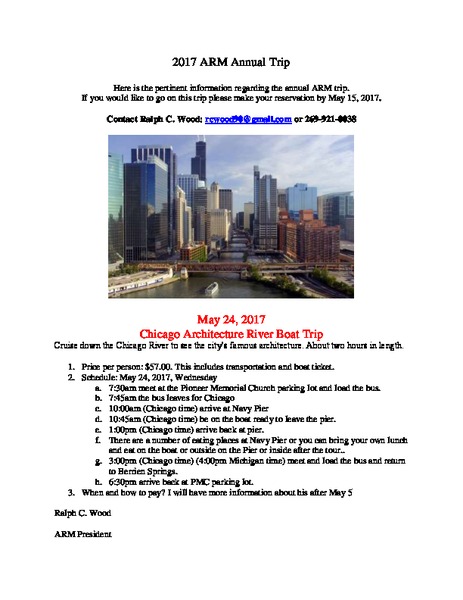 Please write out the check to: “ARM” or “Adventist Retirees of Michiana.” In the bottom left hand corner of the check in the “For” of “Memo” line write “Chicago Trip.”