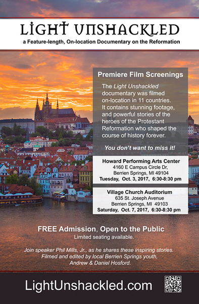 The premiere film screenings of Light Unshackled," a feature-length, on-location documentary on the Protestant Reformation, will be held twice in Berrien Springs. Light Unshackled contains stunning footage and powerful stories of the heroes of the Protestant Reformation who shaped the course of history forever.