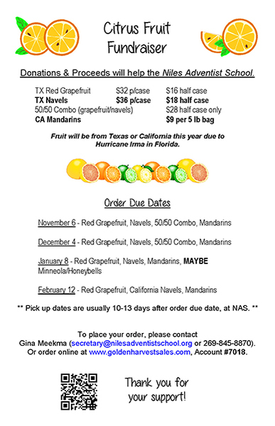 To order TX Red grapefruit, TX navels, a navel/grapefruit combination box, or CA mandarins, please contact Gina (secretary@nilesadventistschool.org or 269-845-8870) or go to www.goldenharvestsales.com, Account #7018, by November 6. See www.NilesAdventistSchool.org or call for prices. Pick-up dates at Niles Adventist School (110 N Fairview, Niles, MI) are usually 10–13 days after the order due date.