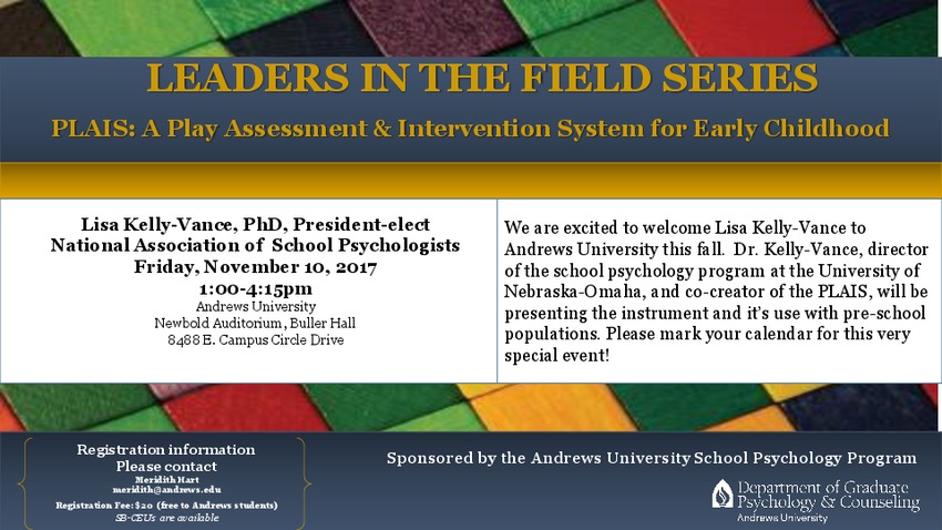 Kelly-Vance, director of the school psychology program at the University of Nebraska-Omaha, and co-creator of the PLAIS, will be presenting the instrument and its use with preschool populations. Please mark your calendars for this very special event. CEUs will be offered.