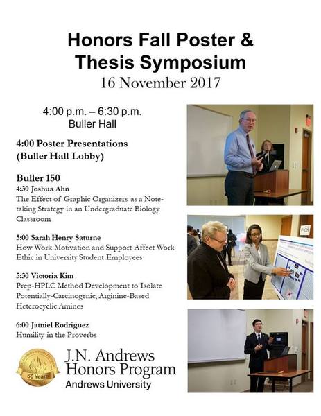 The Andrews University J.N. Andrews Honors Program will host the fall Honors Thesis Symposium on Thursday, Nov. 16, from 4–6:30 p.m. in Buller Hall. Poster presentations will be held in the Buller Hall Lobby from 4–4:30 p.m., then a series of 30–minute talks will be held in Buller Hall 108. The fall Honors Thesis Symposium is held for Honors Scholars completing their degree requirements in time for December graduation.