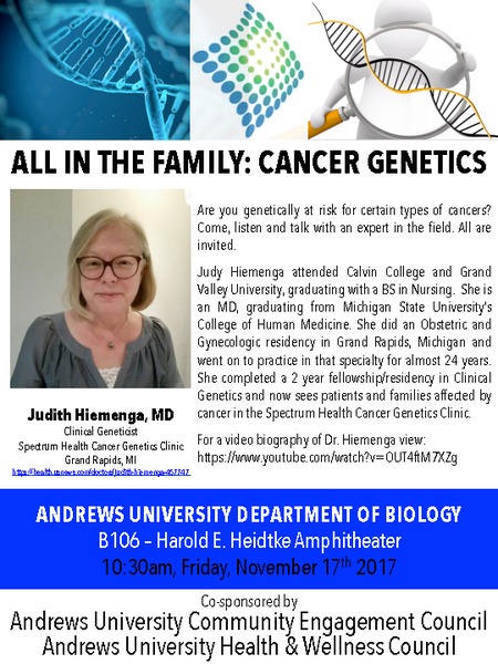 The lecture - All in the Family: Cancer Genetics - will be held this Friday, November 17, 2017 at 10:30am (EST) in B106 - Harold E. Heidtke Amphitheater in the Department of Biology, Science Building, on the campus of Andrews University.