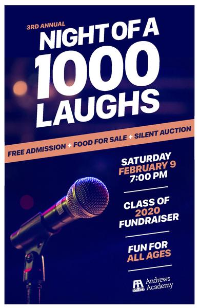 Join us for the 3rd annual NIGHT OF A 1000 LAUGHS on Saturday night, Feb. 9 at 7 p.m. This event will take place at Andrews Academy and it is FREE and open to all. People of all ages will enjoy this special night of family-friendly comedy. Make plans to attend and bring a friend!