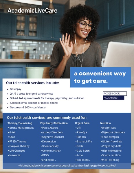 This high-quality, on-demand medical care is designed with students and staff in mind! The Andrews University Care Hub (link below) is the best way to see a therapist from your place of convenience, even when you're on the go. For students, use access code: ALCANDU23. For staff, use access code: ALCANUS23.