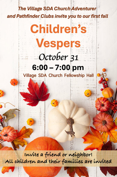 Children's Vespers will take place on Oct. 31 from 6–7 p.m. in the Fellowship Hall of Village Seventh-day Adventist Church (635 St. Joseph Ave. Berrien Springs, MI 49103).