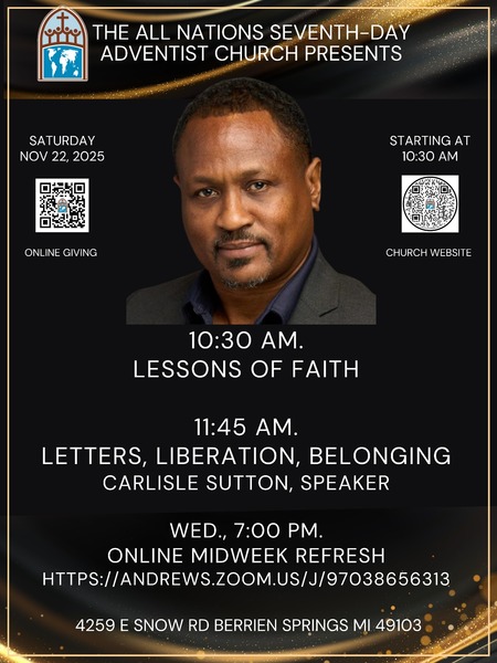 Join us for our worship experience at the All Nations SDA Church this Saturday, November 22, at 11:45 am, as Carlisle Sutton presents "Letters, Liberation, Belonging." Adult and Children's Sabbath School begins at 10:30 am. We will have breakfast at 9:45 am. We look forward to seeing you there!