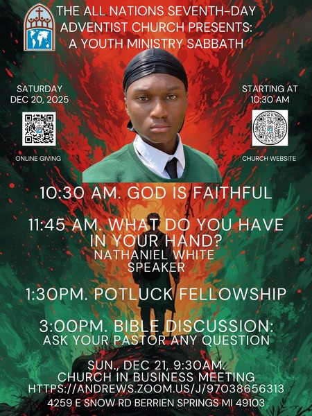 Join us for our Youth Ministry Day at the All Nations SDA Church this Saturday, December 20, at 11:45 am, as Nathaniel White speaks on "What Do You Have in Your Hand?" Adult and Children's Sabbath School begins at 10:30 am. We will have lunch after the service, followed by a Bible discussion at 3:o0 pm. See you there!