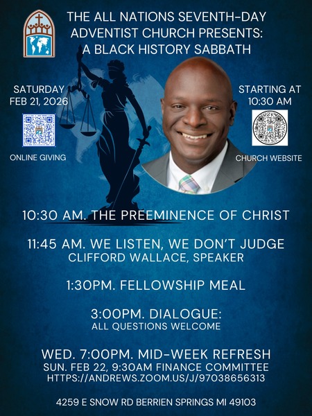 Join us for our Black History worship experience at the All Nations SDA Church this Saturday, February 21, at 11:45 am, as Clifford Wallace presents "We Listen, We Don't Judge." Adult and Children's Sabbath School begins at 10:30 am. We will have our fellowship luncheon after the service. See you there!