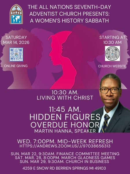 Join us for our worship experience at the All Nations SDA Church this Saturday, March 8, at 11:45 am, as Martin Hanna presents "Hidden Figures: Overdue Honor." Adult and Children's Sabbath School begins at 10:30 am. We look forward to seeing you there!