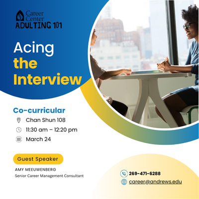 Interviews don’t have to be intimidating. Learn how to prepare effectively, present yourself professionally and answer questions with confidence to make a strong impression. This session will be presented on Tuesday, March 24, 2026, from 11:30 a.m.–12:20 p.m. in Chan Shun Hall, Room 108. It is open to all majors, including graduate students. Cocurricular credit will be provided. A hybrid option is available for distance learning students only by contacting career@andrews.edu.