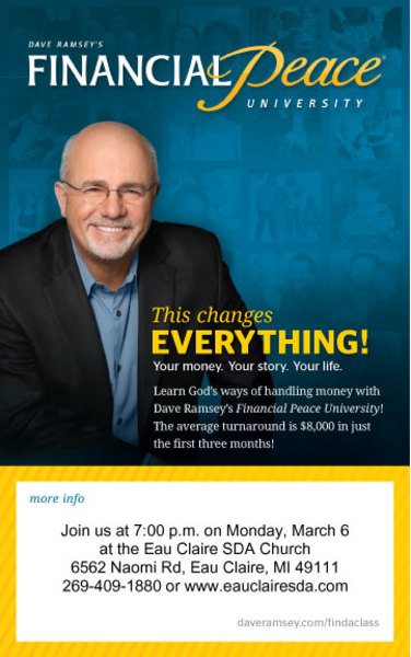 Michigan Blood Drive: This Tuesday, March 7, from 2-6:30 p.m. at Niles Adventist School (110 N Fairview Ave, Niles, MI). Please contact the school at 269-683-5444 to sign up to donate blood. If you have questions about blood... read moreFinancial Peace: Eau Claire Class