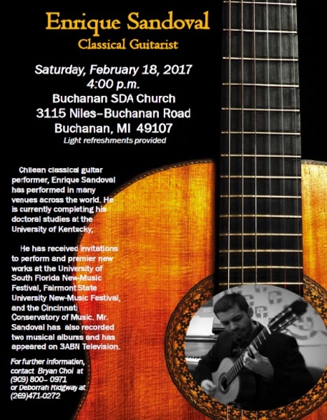 Enrique Sandoval, Classical Guitarist Saturday February 18, 2017 @ 4pm at Buchanan SDA Church 3115 Niles Buchanan Road, Buchanan MI 49107.