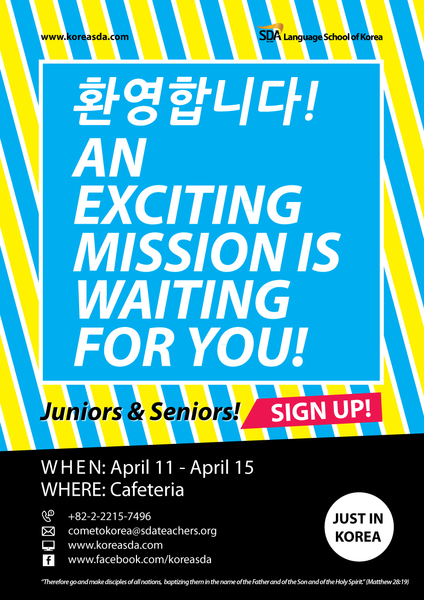 Pastor Sang Jae Choi, Academic Dean for SDA Language School of Korea, is recruiting on campus from April 11 - 15th. Stop by the table in the Student Center to meet Pastor Choi, pick up...