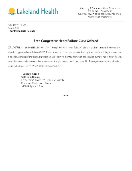 Free Congestive Heart Failure Class Offered (ST. JOSEPH) – Lakeland Health will offer “Living Well with Heart Failure,” a free class for community members about congestive heart failure (CHF). This chronic condition is... read moreVillage Church for March 21