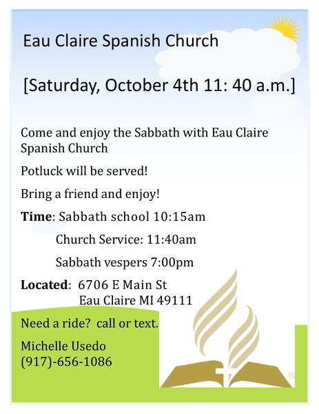 South Bend Junior Academy (SBJA) invites you to their 6th Annual International Food Fair. Join us for some great food, live music, and celebration of culture on Sunday, October 26, from 1–3 p.m. We are located at 1910... read moreEau Claire SDA Church for October 11