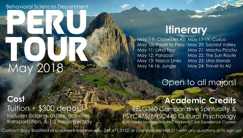 Join us on our next Peru Tour - May10-24, 2018! We will spend two weeks in Peru visiting historical and cultural sites!  The cost for students is 6 credits of tuition plus a $300... read more