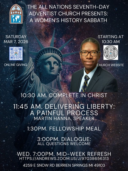 Join us for our worship experience at the All Nations Seventh-day Adventist Church this Saturday, March 7, at 11:45 a.m. as Martin Hanna presents "Delivering Liberty: A Painful Process." Adult and Children's Sabbath School begins at 10:30 a.m.... read more